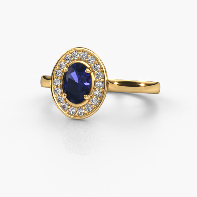The ring shown above is called Madelon 1. This type of ring is known as a solitaire ring. The 14 Carat gold ring is set with a 7x5 mm oval sapphire centre stone surrounded by smaller sized diamonds. This best price gold halo ring, is set with a big sapphire embraced by smaller sized gemstones. The ring got its name for its halo which the smaller sized diamonds help create. In order to achieve a stunning halo, these smaller sized gemstones have to be aligned perfectly so light reflects evenly on the sapphire from every angle. And our expert goldsmiths get the job done. Each carefully selected sapphire is set by hand with utmost precision. During manufacturing, light fall is constantly monitored to make sure the special halo effect is still visible. In the end you get a unique ring with a radiant sapphire gemstone centrepiece. An exquisite ring indeed! The best part of this best price ring is that you can customize it to your own liking. Your style, your choice, your ring. On top of that, your classic gold ring will be made by hand with eco-friendly materials! Please feel free to easily customize the ring, using our online tool.Are you on a budget? Please feel free to contact us, so we can go discuss your options. We offer our rings at guaranteed best price, because we make them to order. You won't find such a price anywhere else!To make it easier for you, we offer a 30 day return policy. Check our terms and conditions.