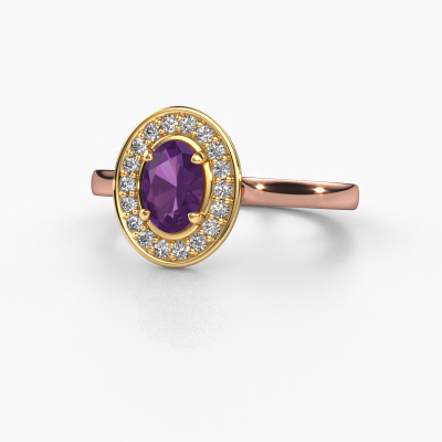 The ring shown above is called Madelon 1. This type of ring is known as a solitaire ring. The 14 Carat rose gold ring is set with a 7x5 mm oval amethyst centre stone surrounded by smaller sized diamonds. This best price rose gold halo ring, is set with a big amethyst embraced by smaller sized gemstones. The ring got its name for its halo which the smaller sized diamonds help create. In order to achieve a stunning halo, these smaller sized gemstones have to be aligned perfectly so light reflects evenly on the amethyst from every angle. And our expert goldsmiths get the job done. Each carefully selected amethyst is set by hand with utmost precision. During manufacturing, light fall is constantly monitored to make sure the special halo effect is still visible. In the end you get a unique ring with a radiant amethyst gemstone centrepiece. An exquisite ring indeed! The best part of this best price ring is that you can customize it to your own liking. Your style, your choice, your ring. On top of that, your classic rose gold ring will be made by hand with eco-friendly materials! Please feel free to easily customize the ring, using our online tool.Are you on a budget? Please feel free to contact us, so we can go discuss your options. We offer our rings at guaranteed best price, because we make them to order. You won't find such a price anywhere else!To make it easier for you, we offer a 30 day return policy. Check our terms and conditions.
