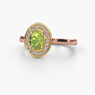 The ring shown above is called Madelon 1. This type of ring is known as a solitaire ring. The 14 Carat rose gold ring is set with a 7x5 mm oval peridot centre stone surrounded by smaller sized diamonds. This best price rose gold halo ring, is set with a big peridot embraced by smaller sized gemstones. The ring got its name for its halo which the smaller sized diamonds help create. In order to achieve a stunning halo, these smaller sized gemstones have to be aligned perfectly so light reflects evenly on the peridot from every angle. And our expert goldsmiths get the job done. Each carefully selected peridot is set by hand with utmost precision. During manufacturing, light fall is constantly monitored to make sure the special halo effect is still visible. In the end you get a unique ring with a radiant peridot gemstone centrepiece. An exquisite ring indeed! The best part of this best price ring is that you can customize it to your own liking. Your style, your choice, your ring. On top of that, your classic rose gold ring will be made by hand with eco-friendly materials! Please feel free to easily customize the ring, using our online tool.Are you on a budget? Please feel free to contact us, so we can go discuss your options. We offer our rings at guaranteed best price, because we make them to order. You won't find such a price anywhere else!To make it easier for you, we offer a 30 day return policy. Check our terms and conditions.