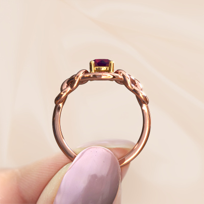 This symbolic rose gold Zoe ring is set with rhodolite. For some, a ring is nothing more than a beautiful fashion item but they can become a meaningful keepsake. A ring such as this can be worn daily and it matches numerous different styles. Designing your own unique ring, makes it even more special. You are reminded of its uniqueness every time you look at it. Perhaps it reminds you of someone special. It might bring back memories. Unforgettable moments, represented in one ring. The beauty of it all is that the used precious metals and gemstones will last a lifetime. A lifetime of memories deserves nothing less! The best part of this knot ring is that you can customize it to your own liking. Your style, your choice, your ring. On top of that, your Celtic rose gold ring will be made by hand with eco-friendly materials! Please feel free to easily customize the ring, using our online tool.By using our modern techniques, we can design and customize the finest quality jewels with the utmost care for you. Our rings are always priced 30 percent lower than other jewellers. We make rings to order, so we don't have to maintain a large stock. If you have a certain budget, we are more than happy to advice you accordingly.To make it easier for you, we offer a 30 day return policy. Check our terms and conditions.