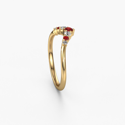 This Imani A stacking ring in 14 Carat gold is set with ruby. This gold stacked Imani A ring is the perfect addition to your ring collection! As the name suggests, it is a ring which can be combined on one finger with another ring. It gives you the opportunity to create your own style. A stacked ring usually represents a certain memory of someone special or a memorable moment. It is common to combine a stacked ring, representing an anniversary, with a wedding ring. But this graceful ring, combined with your other rings, also makes a classy fashion item. As soon as you finished designing your Imani A stacking ring with our online tool, our goldsmiths will start their creative process of making your ring. This will be done with passion and care, according ancient crafting. On top of that, our jewels are made of eco-friendly materials. Simply customize online with our online tool, if you want any changes made. If you want specific changes made to your Imani A stacking ring, that are unavailable in our online tool, please feel free to contact our expert designers.Because we design and deliver our own rings, we can offer you a ring at a price you won't find anywhere else. A ring is made to order, which helps prevent excess supplies, so we can make you a great price offer. We understand it feels risky, buying your ring online, but we will gladly assist in the designing process, taking your budget into consideration.To make it easier for you, we offer a 30 day return policy. Check our terms and conditions.
