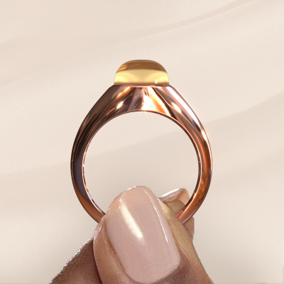 In this photo the rose gold Zaza ring is set with a cabochon citrin. Cabochon means a citrin is shaped first, not faceted, into a specific shape, such as a drop, heart or oval cabochon. Subsequently, it is polished until the gemstone has a orb shaped surface. A cabochon gemstone is a stunning, classy eye-catcher that matches perfectly with a contemporary as well as a vintage style. Our expert goldsmiths shape the 1 stone ring to perfection which makes it unique. The cabochon citrin is set so its unique qualities are strengthened. A customized design ring is the perfect gift! New exquisite designs are added daily by our team of passionate goldsmiths. And each design can be customized. Simply customize the precious metals and the colour of gemstones which will be used, for example. This makes your design of the design Zaza ring truly unique!After receiving your order, our goldsmiths will start the creative process of making your Zaza ring. We don't keep stock. This is advantageous because these costs will not be passed on to you. Therefore, we can offer jewellery at exceptionally low prices.To make it easier for you, we offer a 30 day return policy. Check our terms and conditions.