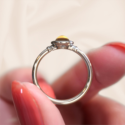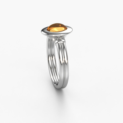 In this photo the platinum Brittni ring is set with a cabochon citrin. Cabochon means a citrin is shaped first, not faceted, into a specific shape, such as a drop, heart or oval cabochon. Subsequently, it is polished until the gemstone has a orb shaped surface. A cabochon gemstone is a stunning, classy eye-catcher that matches perfectly with a contemporary as well as a vintage style. Our expert goldsmiths shape the tasteful ring to perfection which makes it unique. The cabochon citrin is set so its unique qualities are strengthened. Our goldsmiths passionately create your customized ring to your liking with the utmost care. The platinum ring, as shown here, can be customized using our online tool. Feel free to ask our jewel designers for assistance if you want changes made which are unavailable in our online tool. We are happy to answer your questions.Because we design and deliver our own rings, we can offer you a ring at a price you won't find anywhere else. A ring is made to order, which helps prevent excess supplies, so we can make you a great price offer. We understand it feels risky, buying your ring online, but we will gladly assist in the designing process, taking your budget into consideration.To make it easier for you, we offer a 30 day return policy. Check our terms and conditions.