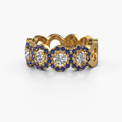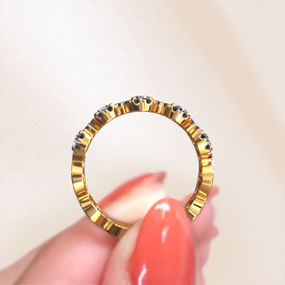 This Tanisha ring in 14 Carat gold is set with sapphire. This gold stacked Tanisha ring is the perfect addition to your ring collection! As the name suggests, it is a ring which can be combined on one finger with another ring. It gives you the opportunity to create your own style. A stacked ring usually represents a certain memory of someone special or a memorable moment. It is common to combine a stacked ring, representing an anniversary, with a wedding ring. But this graceful ring, combined with your other rings, also makes a classy fashion item. The best part of this graceful ring is that you can customize it to your own liking. Your style, your choice, your ring. On top of that, your classic gold ring will be made by hand with eco-friendly materials! Please feel free to easily customize the ring, using our online tool.By using a combination of the latest modern techniques, combined with ancient crafting, we can make all our rings in our own studio. Each jewel is made to order. This is advantageous because we can offer you a price you won't find anywhere else.To make it easier for you, we offer a 30 day return policy. Check our terms and conditions.
