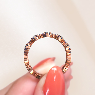 This Tanisha ring in 14 Carat rose gold is set with sapphire. This rose gold stacked Tanisha ring is the perfect addition to your ring collection! As the name suggests, it is a ring which can be combined on one finger with another ring. It gives you the opportunity to create your own style. A stacked ring usually represents a certain memory of someone special or a memorable moment. It is common to combine a stacked ring, representing an anniversary, with a wedding ring. But this graceful ring, combined with your other rings, also makes a classy fashion item. The best part of this graceful ring is that you can customize it to your own liking. Your style, your choice, your ring. On top of that, your classic rose gold ring will be made by hand with eco-friendly materials! Please feel free to easily customize the ring, using our online tool.By using a combination of the latest modern techniques, combined with ancient crafting, we can make all our rings in our own studio. Each jewel is made to order. This is advantageous because we can offer you a price you won't find anywhere else.To make it easier for you, we offer a 30 day return policy. Check our terms and conditions.