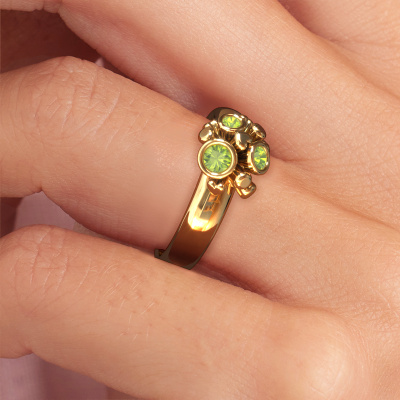 How would you describe your own style? Are you looking for something uniquely different? This flower gold Pameila ring is astonishing! Simply customize to your or her own liking. This ring is set with peridot. These peridot have been carefully selected because your ring must be adorned with nothing but the most beautiful gemstone. Wouldn't you agree? Our expert goldsmith will create your ring in our own crafting studios, where the peridot will be set with care. The ring will then be polished to perfection to give it that extra sparkle. It's a perfect ring for a woman of excellent taste!How do you like this contemporary gold ring? Simply customize this Pameila ring, using our online tool. Subsequently, your personal flower Pameila ring will be made by hand by our goldsmiths. Precious metals and gemstones can be customized to your liking. Do you have specific preferences which are unavailable in our online tool? Please feel free to contact us. We will customize your personal contemporary ring to your liking.Are you on a budget? Please feel free to contact us, so we can go discuss your options. We offer our rings at guaranteed best price, because we make them to order. You won't find such a price anywhere else!To make it easier for you, we offer a 30 day return policy. Check our terms and conditions.