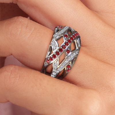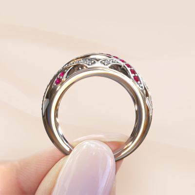This ring called Yinthe is made of 14 Carat white gold and is set with ruby. Are you in the market for a unique white gold ring with a modern twist? Then this ring might suit you. Simply customize to your or her liking. It suits the contemporary modern woman. This contemporary ring is set with beautiful ruby. This has been carefully selected. Because your ring must be adorned with nothing but the most stunning gemstone. Our expert goldsmith will create your ring in our own studio, where the ruby will be set with great care. The ring will then be polished to perfection to create a stunning ring. By using our modern techniques, we can design and customize the finest quality jewels with the utmost care for you. Our rings are always priced 30 percent lower than other jewellers. We make rings to order, so we don't have to maintain a large stock. If you have a certain budget, we are more than happy to advice you accordingly.Our talented designers add new designs to our online collection daily. Together they create a diverse collection of the finest jewellery. If you prefer to make a ring according your own design, please feel free to request a quote. We will make you an amazing offer, based on quality and price.To make it easier for you, we offer a 30 day return policy. Check our terms and conditions.