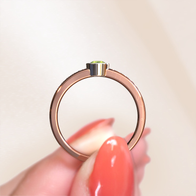 How would you describe your own style? Are you looking for something uniquely different? This edgy rose gold Ise 2 ring is astonishing! Simply customize to your or her own liking. This ring is set with peridot. These peridot have been carefully selected because your ring must be adorned with nothing but the most beautiful gemstone. Wouldn't you agree? Our expert goldsmith will create your ring in our own crafting studios, where the peridot will be set with care. The ring will then be polished to perfection to give it that extra sparkle. It's a perfect ring for a woman of excellent taste!Customize your own edgyIse 2 ring, which will then be created by our goldsmiths with great passion. Do you prefer a different option than is shown here in the rose gold Ise 2 ring? Then our online tools offers various options. Feel free to ask us for help if you are unable to succeed. We are happy to answer your questions!Are you on a budget? Please feel free to contact us, so we can go discuss your options. We offer our rings at guaranteed best price, because we make them to order. You won't find such a price anywhere else!To make it easier for you, we offer a 30 day return policy. Check our terms and conditions.