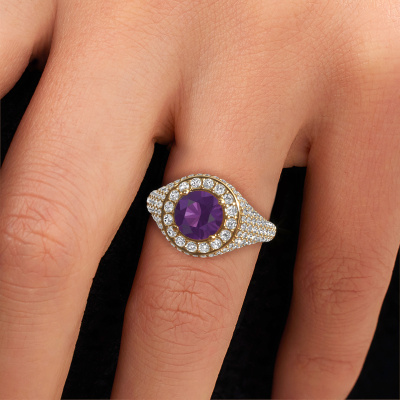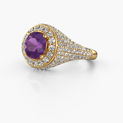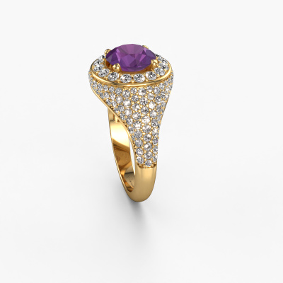 This pave set ring is called Dayle. This 14 Carat gold ring is set with amethysten 7 mm. The band of this gold ring is set with rows of amethysten which seem to have no beginning nor end. Our goldsmith carefully selects the gemstones and sets them with the utmost precision. For maximum shine, the amethysten have to align perfectly. While artfully crafting and polishing the jewellery, light fall is constantly monitored, until the expert goldsmith is satisfied with the result. Designed by you, created especially for you!The best part of this elegant ring is that you can customize it to your own liking. Your style, your choice, your ring. On top of that, your exclusive gold ring will be made by hand with eco-friendly materials! Please feel free to easily customize the ring, using our online tool.Are you on a budget? Please feel free to contact us, so we can go discuss your options. We offer our rings at guaranteed best price, because we make them to order. You won't find such a price anywhere else!To make it easier for you, we offer a 30 day return policy. Check our terms and conditions.