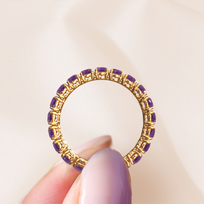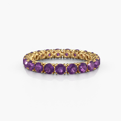 This is our Vivienne 2.9 ring. This specific type is called an eternity ring and it is set with a continuous line of identically cut gemstones. The ring is made in 14 Carat gold and is set with small amethysten, 2.9 mm. This gold Eternity ring is a perfectly beautiful and meaningful way to give your proposal that special touch. The magnificent evenly shaped amethysten are pave set around the ring. The identical amethysten are carefully selected to give the ring a maximum effect. Do keep in mind we use natural resources so small differences between stones are common. The special effect is enhanced due to precise positioning of the amethysten. This requires the utmost precision and a skilful hand but for our skilled artisans this is what excites them. The result is a ring with a row of amethysten which seem to have no beginning nor end. The perfect symbol of your love for her! Isn't she a beauty?By using our modern techniques, we can design and customize the finest quality jewels with the utmost care for you. Our rings are always priced 30 percent lower than other jewellers. We make rings to order, so we don't have to maintain a large stock. If you have a certain budget, we are more than happy to advice you accordingly.New jewellery designs are added to our online collection daily. Our team of passionate designers strive to create extraordinary and diverse designs. Have you seen a ring you like? Please feel free to contact us. Based on a good price/ quality ratio, we will make you an offer you can't refuse!To make it easier for you, we offer a 30 day return policy. Check our terms and conditions.