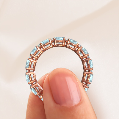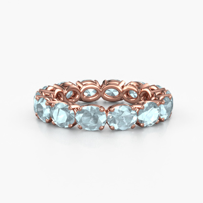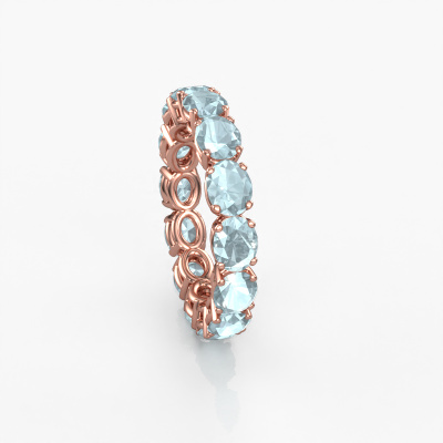 This is our Vivienne OVL 5x4 ring. This specific type is called an eternity ring and it is set with a continuous line of identically cut gemstones. The ring is made in 14 Carat rose gold and is set with small aquamarine, 5x4 mm. This rose gold Eternity ring is a perfectly beautiful and meaningful way to give your proposal that special touch. The magnificent evenly shaped aquamarine are pave set around the ring. The identical aquamarine are carefully selected to give the ring a maximum effect. Do keep in mind we use natural resources so small differences between stones are common. The special effect is enhanced due to precise positioning of the aquamarine. This requires the utmost precision and a skilful hand but for our skilled artisans this is what excites them. The result is a ring with a row of aquamarine which seem to have no beginning nor end. The perfect symbol of your love for her! Isn't she a beauty?By using our modern techniques, we can design and customize the finest quality jewels with the utmost care for you. Our rings are always priced 30 percent lower than other jewellers. We make rings to order, so we don't have to maintain a large stock. If you have a certain budget, we are more than happy to advice you accordingly.New jewellery designs are added to our online collection daily. Our team of passionate designers strive to create extraordinary and diverse designs. Have you seen a ring you like? Please feel free to contact us. Based on a good price/ quality ratio, we will make you an offer you can't refuse!To make it easier for you, we offer a 30 day return policy. Check our terms and conditions.