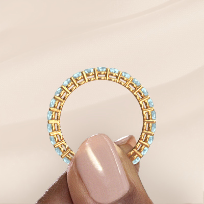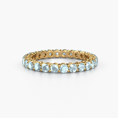 This is our Michelle full 2.4 ring. This specific type is called an eternity ring and it is set with a continuous line of identically cut gemstones. The ring is made in 14 Carat gold and is set with small aquamarine, 2.4 mm. This gold Eternity ring is a perfectly beautiful and meaningful way to give your proposal that special touch. The magnificent evenly shaped aquamarine are pave set around the ring. The identical aquamarine are carefully selected to give the ring a maximum effect. Do keep in mind we use natural resources so small differences between stones are common. The special effect is enhanced due to precise positioning of the aquamarine. This requires the utmost precision and a skilful hand but for our skilled artisans this is what excites them. The result is a stackable ring with a row of aquamarine which seem to have no beginning nor end. The perfect symbol of your love for her! Isn't she a beauty?After receiving your order, our goldsmiths will start the creative process of making your Michelle full 2.4 ring. We don't keep stock. This is advantageous because these costs will not be passed on to you. Therefore, we can offer jewellery at exceptionally low prices.