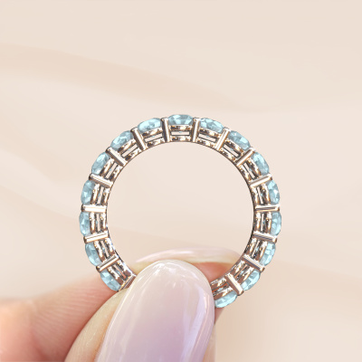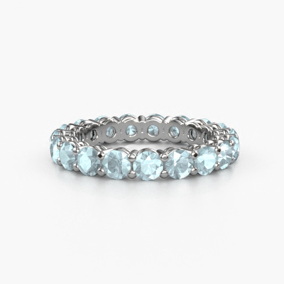 This is our Michelle full 3.4 ring. This specific type is called an eternity ring and it is set with a continuous line of identically cut gemstones. The ring is made in platinum and is set with small aquamarine, 3.4 mm. This platinum Eternity ring is a perfectly beautiful and meaningful way to give your proposal that special touch. The magnificent evenly shaped aquamarine are pave set around the ring. The identical aquamarine are carefully selected to give the ring a maximum effect. Do keep in mind we use natural resources so small differences between stones are common. The special effect is enhanced due to precise positioning of the aquamarine. This requires the utmost precision and a skilful hand but for our skilled artisans this is what excites them. The result is a stackable ring with a row of aquamarine which seem to have no beginning nor end. The perfect symbol of your love for her! Isn't she a beauty?By using a combination of the latest modern techniques, combined with ancient crafting, we can make all our rings in our own studio. Each jewel is made to order. This is advantageous because we can offer you a price you won't find anywhere else.New jewellery designs are added to our online collection daily. Our team of passionate designers strive to create extraordinary and diverse designs. Have you seen a ring you like? Please feel free to contact us. Based on a good price/ quality ratio, we will make you an offer you can't refuse!To make it easier for you, we offer a 30 day return policy. Check our terms and conditions.