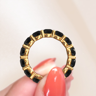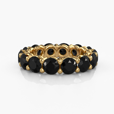 This is our Heddy rnd 4.7 ring. This specific type is called an eternity ring and it is set with a continuous line of identically cut gemstones. The ring is made in 14 Carat gold and is set with small black diamonds, 0.48 crt. This gold Eternity ring is a perfectly beautiful and meaningful way to give your proposal that special touch. The magnificent evenly shaped black diamonds are pave set around the ring. The identical black diamonds are carefully selected to give the ring a maximum effect. Do keep in mind we use natural resources so small differences between stones are common. The special effect is enhanced due to precise positioning of the black diamonds. This requires the utmost precision and a skilful hand but for our skilled artisans this is what excites them. The result is a ring with a row of black diamonds which seem to have no beginning nor end. The perfect symbol of your love for her! Isn't she a beauty?Because we design and deliver our own rings, we can offer you a ring at a price you won't find anywhere else. A ring is made to order, which helps prevent excess supplies, so we can make you a great price offer. We understand it feels risky, buying your ring online, but we will gladly assist in the designing process, taking your budget into consideration.Our team of talented, passionate designers add new ring designs to our online collection daily. Our objective in doing so, is to be able to offer you a wide variety of jewels. Please feel free to request a quote if you have specific wishes for your ring. We guarantee to make you an offer you can't refuse.To make it easier for you, we offer a 30 day return policy. Check our terms and conditions.