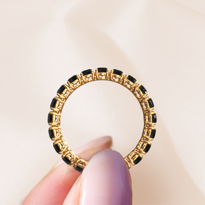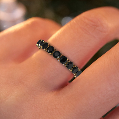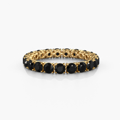 This is our Vivienne 2.9 ring. This specific type is called an eternity ring and it is set with a continuous line of identically cut gemstones. The ring is made in 14 Carat gold and is set with small black diamonds, 0.114 crt. This gold Eternity ring is a perfectly beautiful and meaningful way to give your proposal that special touch. The magnificent evenly shaped black diamonds are pave set around the ring. The identical black diamonds are carefully selected to give the ring a maximum effect. Do keep in mind we use natural resources so small differences between stones are common. The special effect is enhanced due to precise positioning of the black diamonds. This requires the utmost precision and a skilful hand but for our skilled artisans this is what excites them. The result is a ring with a row of black diamonds which seem to have no beginning nor end. The perfect symbol of your love for her! Isn't she a beauty?By using our modern techniques, we can design and customize the finest quality jewels with the utmost care for you. Our rings are always priced 30 percent lower than other jewellers. We make rings to order, so we don't have to maintain a large stock. If you have a certain budget, we are more than happy to advice you accordingly.New jewellery designs are added to our online collection daily. Our team of passionate designers strive to create extraordinary and diverse designs. Have you seen a ring you like? Please feel free to contact us. Based on a good price/ quality ratio, we will make you an offer you can't refuse!To make it easier for you, we offer a 30 day return policy. Check our terms and conditions.