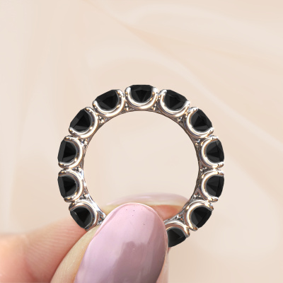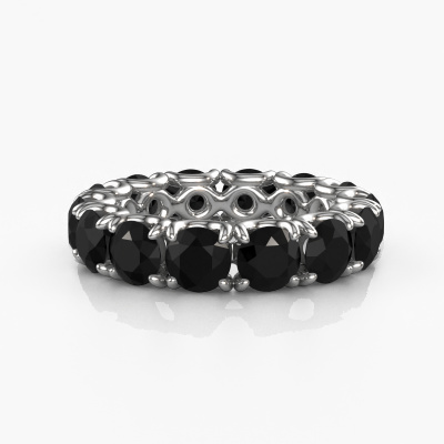 This is our Estee 4.7 ring. This specific type is called an eternity ring and it is set with a continuous line of identically cut gemstones. The ring is made in 14 Carat white gold and is set with small black diamonds, 0.48 crt. This white gold Eternity ring is a perfectly beautiful and meaningful way to give your proposal that special touch. The magnificent evenly shaped black diamonds are pave set around the ring. The identical black diamonds are carefully selected to give the ring a maximum effect. Do keep in mind we use natural resources so small differences between stones are common. The special effect is enhanced due to precise positioning of the black diamonds. This requires the utmost precision and a skilful hand but for our skilled artisans this is what excites them. The result is a ring with a row of black diamonds which seem to have no beginning nor end. The perfect symbol of your love for her! Isn't she a beauty?By using our modern techniques, we can design and customize the finest quality jewels with the utmost care for you. Our rings are always priced 30 percent lower than other jewellers. We make rings to order, so we don't have to maintain a large stock. If you have a certain budget, we are more than happy to advice you accordingly.