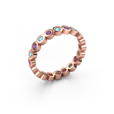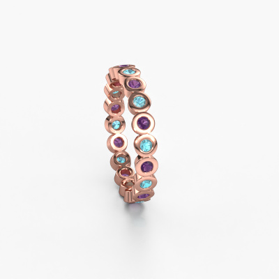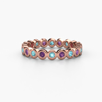 This is our Edwina 1 ring. This specific type is called an eternity ring and it is set with a continuous line of identically cut gemstones. The ring is made in 14 Carat rose gold and is set with small blue topaz, 2 mm. This rose gold Eternity ring is a perfectly beautiful and meaningful way to give your proposal that special touch. The magnificent evenly shaped blue topaz are pave set around the ring. The identical blue topaz are carefully selected to give the ring a maximum effect. Do keep in mind we use natural resources so small differences between stones are common. The special effect is enhanced due to precise positioning of the blue topaz. This requires the utmost precision and a skilful hand but for our skilled artisans this is what excites them. The result is a stackable ring with a row of blue topaz which seem to have no beginning nor end. The perfect symbol of your love for her! Isn't she a beauty?By using our modern techniques, we can design and customize the finest quality jewels with the utmost care for you. Our rings are always priced 30 percent lower than other jewellers. We make rings to order, so we don't have to maintain a large stock. If you have a certain budget, we are more than happy to advice you accordingly.New jewellery designs are added to our online collection daily. Our team of passionate designers strive to create extraordinary and diverse designs. Have you seen a ring you like? Please feel free to contact us. Based on a good price/ quality ratio, we will make you an offer you can't refuse!To make it easier for you, we offer a 30 day return policy. Check our terms and conditions.