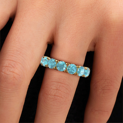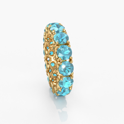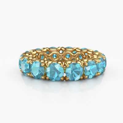 This is our Estee 4.7 ring. This specific type is called an eternity ring and it is set with a continuous line of identically cut gemstones. The ring is made in 14 Carat gold and is set with small blue topaz, 4.7 mm. This gold Eternity ring is a perfectly beautiful and meaningful way to give your proposal that special touch. The magnificent evenly shaped blue topaz are pave set around the ring. The identical blue topaz are carefully selected to give the ring a maximum effect. Do keep in mind we use natural resources so small differences between stones are common. The special effect is enhanced due to precise positioning of the blue topaz. This requires the utmost precision and a skilful hand but for our skilled artisans this is what excites them. The result is a ring with a row of blue topaz which seem to have no beginning nor end. The perfect symbol of your love for her! Isn't she a beauty?By using our modern techniques, we can design and customize the finest quality jewels with the utmost care for you. Our rings are always priced 30 percent lower than other jewellers. We make rings to order, so we don't have to maintain a large stock. If you have a certain budget, we are more than happy to advice you accordingly.