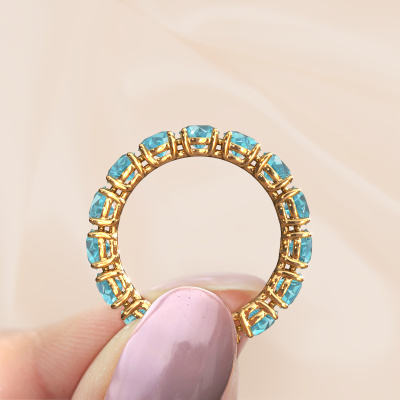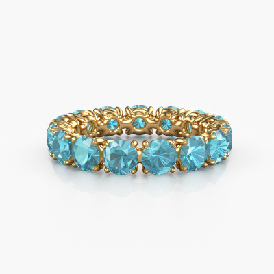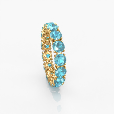 This is our Vivienne 4.2 ring. This specific type is called an eternity ring and it is set with a continuous line of identically cut gemstones. The ring is made in 14 Carat gold and is set with small blue topaz, 4.2 mm. This gold Eternity ring is a perfectly beautiful and meaningful way to give your proposal that special touch. The magnificent evenly shaped blue topaz are pave set around the ring. The identical blue topaz are carefully selected to give the ring a maximum effect. Do keep in mind we use natural resources so small differences between stones are common. The special effect is enhanced due to precise positioning of the blue topaz. This requires the utmost precision and a skilful hand but for our skilled artisans this is what excites them. The result is a ring with a row of blue topaz which seem to have no beginning nor end. The perfect symbol of your love for her! Isn't she a beauty?By using a combination of the latest modern techniques, combined with ancient crafting, we can make all our rings in our own studio. Each jewel is made to order. This is advantageous because we can offer you a price you won't find anywhere else.