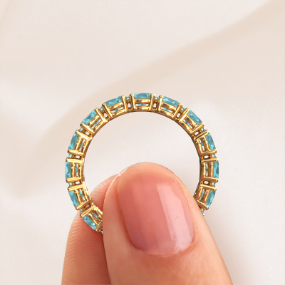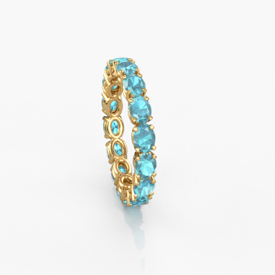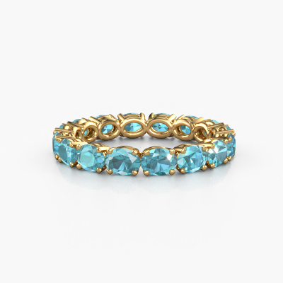 This is our Vivienne OVL 4x3 ring. This specific type is called an eternity ring and it is set with a continuous line of identically cut gemstones. The ring is made in 14 Carat gold and is set with small blue topaz, 4x3 mm. This gold Eternity ring is a perfectly beautiful and meaningful way to give your proposal that special touch. The magnificent evenly shaped blue topaz are pave set around the ring. The identical blue topaz are carefully selected to give the ring a maximum effect. Do keep in mind we use natural resources so small differences between stones are common. The special effect is enhanced due to precise positioning of the blue topaz. This requires the utmost precision and a skilful hand but for our skilled artisans this is what excites them. The result is a ring with a row of blue topaz which seem to have no beginning nor end. The perfect symbol of your love for her! Isn't she a beauty?Because we design and deliver our own rings, we can offer you a ring at a price you won't find anywhere else. A ring is made to order, which helps prevent excess supplies, so we can make you a great price offer. We understand it feels risky, buying your ring online, but we will gladly assist in the designing process, taking your budget into consideration.Our team of talented, passionate designers add new ring designs to our online collection daily. Our objective in doing so, is to be able to offer you a wide variety of jewels. Please feel free to request a quote if you have specific wishes for your ring. We guarantee to make you an offer you can't refuse.To make it easier for you, we offer a 30 day return policy. Check our terms and conditions.