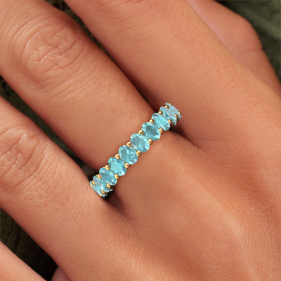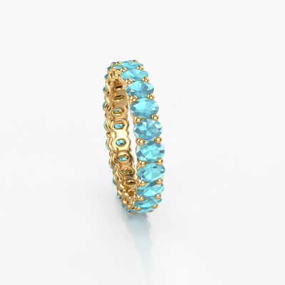 This is our Heddy OVL 3x4 ring. This specific type is called an eternity ring and it is set with a continuous line of identically cut gemstones. The ring is made in 14 Carat gold and is set with small blue topaz, 4x3 mm. This gold Eternity ring is a perfectly beautiful and meaningful way to give your proposal that special touch. The magnificent evenly shaped blue topaz are pave set around the ring. The identical blue topaz are carefully selected to give the ring a maximum effect. Do keep in mind we use natural resources so small differences between stones are common. The special effect is enhanced due to precise positioning of the blue topaz. This requires the utmost precision and a skilful hand but for our skilled artisans this is what excites them. The result is a stackable ring with a row of blue topaz which seem to have no beginning nor end. The perfect symbol of your love for her! Isn't she a beauty?After receiving your order, our goldsmiths will start the creative process of making your Heddy OVL 3x4 ring. We don't keep stock. This is advantageous because these costs will not be passed on to you. Therefore, we can offer jewellery at exceptionally low prices.