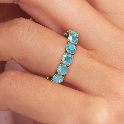 This Vivienne 4.0 stackable ring in 14 Carat gold is set with blue topaz. This gold stacked Vivienne 4.0 ring is the perfect addition to your ring collection! As the name suggests, it is a ring which can be combined on one finger with another ring. It gives you the opportunity to create your own style. A stacked ring usually represents a certain memory of someone special or a memorable moment. It is common to combine a stacked ring, representing an anniversary, with a wedding ring. But this eternity ring, combined with your other rings, also makes a classy fashion item. A customized modern stackable ring is the perfect gift! New exquisite designs are added daily by our team of passionate goldsmiths. And each design can be customized. Simply customize the precious metals and the colour of gemstones which will be used, for example. This makes your design of the modern Vivienne 4.0 stackable ring truly unique!Because we design and deliver our own rings, we can offer you a ring at a price you won't find anywhere else. A ring is made to order, which helps prevent excess supplies, so we can make you a great price offer. We understand it feels risky, buying your ring online, but we will gladly assist in the designing process, taking your budget into consideration.To make it easier for you, we offer a 30 day return policy. Check our terms and conditions.