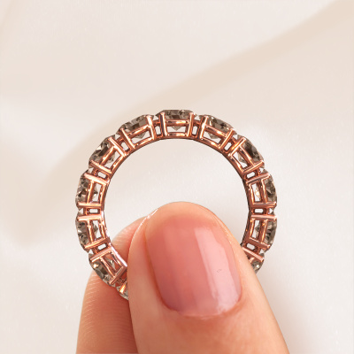 This is our Vivienne OVL 5x4 ring. This specific type is called an eternity ring and it is set with a continuous line of identically cut gemstones. The ring is made in 14 Carat rose gold and is set with small brown diamonds, 0.35 crt. This rose gold Eternity ring is a perfectly beautiful and meaningful way to give your proposal that special touch. The magnificent evenly shaped brown diamonds are pave set around the ring. The identical brown diamonds are carefully selected to give the ring a maximum effect. Do keep in mind we use natural resources so small differences between stones are common. The special effect is enhanced due to precise positioning of the brown diamonds. This requires the utmost precision and a skilful hand but for our skilled artisans this is what excites them. The result is a ring with a row of brown diamonds which seem to have no beginning nor end. The perfect symbol of your love for her! Isn't she a beauty?By using our modern techniques, we can design and customize the finest quality jewels with the utmost care for you. Our rings are always priced 30 percent lower than other jewellers. We make rings to order, so we don't have to maintain a large stock. If you have a certain budget, we are more than happy to advice you accordingly.New jewellery designs are added to our online collection daily. Our team of passionate designers strive to create extraordinary and diverse designs. Have you seen a ring you like? Please feel free to contact us. Based on a good price/ quality ratio, we will make you an offer you can't refuse!To make it easier for you, we offer a 30 day return policy. Check our terms and conditions.