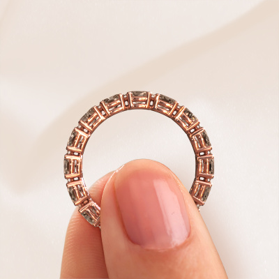 This is our Vivienne OVL 4x3 ring. This specific type is called an eternity ring and it is set with a continuous line of identically cut gemstones. The ring is made in 14 Carat rose gold and is set with small brown diamonds, 0.15 crt. This rose gold Eternity ring is a perfectly beautiful and meaningful way to give your proposal that special touch. The magnificent evenly shaped brown diamonds are pave set around the ring. The identical brown diamonds are carefully selected to give the ring a maximum effect. Do keep in mind we use natural resources so small differences between stones are common. The special effect is enhanced due to precise positioning of the brown diamonds. This requires the utmost precision and a skilful hand but for our skilled artisans this is what excites them. The result is a ring with a row of brown diamonds which seem to have no beginning nor end. The perfect symbol of your love for her! Isn't she a beauty?Because we design and deliver our own rings, we can offer you a ring at a price you won't find anywhere else. A ring is made to order, which helps prevent excess supplies, so we can make you a great price offer. We understand it feels risky, buying your ring online, but we will gladly assist in the designing process, taking your budget into consideration.Our team of talented, passionate designers add new ring designs to our online collection daily. Our objective in doing so, is to be able to offer you a wide variety of jewels. Please feel free to request a quote if you have specific wishes for your ring. We guarantee to make you an offer you can't refuse.To make it easier for you, we offer a 30 day return policy. Check our terms and conditions.