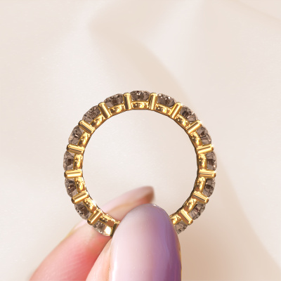 This is our Heddy rnd 3.7 ring. This specific type is called an eternity ring and it is set with a continuous line of identically cut gemstones. The ring is made in 14 Carat gold and is set with small brown diamonds, 0.20 crt. This gold Eternity ring is a perfectly beautiful and meaningful way to give your proposal that special touch. The magnificent evenly shaped brown diamonds are pave set around the ring. The identical brown diamonds are carefully selected to give the ring a maximum effect. Do keep in mind we use natural resources so small differences between stones are common. The special effect is enhanced due to precise positioning of the brown diamonds. This requires the utmost precision and a skilful hand but for our skilled artisans this is what excites them. The result is a stackable ring with a row of brown diamonds which seem to have no beginning nor end. The perfect symbol of your love for her! Isn't she a beauty?By using our modern techniques, we can design and customize the finest quality jewels with the utmost care for you. Our rings are always priced 30 percent lower than other jewellers. We make rings to order, so we don't have to maintain a large stock. If you have a certain budget, we are more than happy to advice you accordingly.New jewellery designs are added to our online collection daily. Our team of passionate designers strive to create extraordinary and diverse designs. Have you seen a ring you like? Please feel free to contact us. Based on a good price/ quality ratio, we will make you an offer you can't refuse!To make it easier for you, we offer a 30 day return policy. Check our terms and conditions.