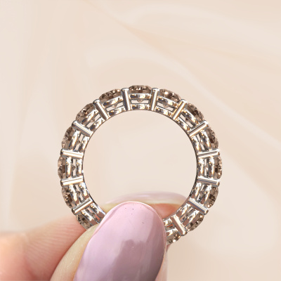 This is our Michelle full 4.2 ring. This specific type is called an eternity ring and it is set with a continuous line of identically cut gemstones. The ring is made in 14 Carat white gold and is set with small brown diamonds, 0.30 crt. This white gold Eternity ring is a perfectly beautiful and meaningful way to give your proposal that special touch. The magnificent evenly shaped brown diamonds are pave set around the ring. The identical brown diamonds are carefully selected to give the ring a maximum effect. Do keep in mind we use natural resources so small differences between stones are common. The special effect is enhanced due to precise positioning of the brown diamonds. This requires the utmost precision and a skilful hand but for our skilled artisans this is what excites them. The result is a stackable ring with a row of brown diamonds which seem to have no beginning nor end. The perfect symbol of your love for her! Isn't she a beauty?After receiving your order, our goldsmiths will start the creative process of making your Michelle full 4.2 ring. We don't keep stock. This is advantageous because these costs will not be passed on to you. Therefore, we can offer jewellery at exceptionally low prices.New jewellery designs are added to our online collection daily. Our team of passionate designers strive to create extraordinary and diverse designs. Have you seen a ring you like? Please feel free to contact us. Based on a good price/ quality ratio, we will make you an offer you can't refuse!To make it easier for you, we offer a 30 day return policy. Check our terms and conditions.