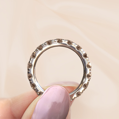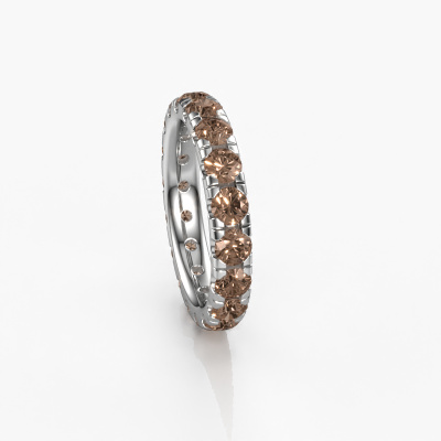 This is our Jackie 3.4 ring. This specific type is called an eternity ring and it is set with a continuous line of identically cut gemstones. The ring is made in 14 Carat white gold and is set with small brown diamonds, 0.15 crt. This white gold Eternity ring is a perfectly beautiful and meaningful way to give your proposal that special touch. The magnificent evenly shaped brown diamonds are pave set around the ring. The identical brown diamonds are carefully selected to give the ring a maximum effect. Do keep in mind we use natural resources so small differences between stones are common. The special effect is enhanced due to precise positioning of the brown diamonds. This requires the utmost precision and a skilful hand but for our skilled artisans this is what excites them. The result is a stackable ring with a row of brown diamonds which seem to have no beginning nor end. The perfect symbol of your love for her! Isn't she a beauty?After receiving your order, our goldsmiths will passionately start the creative process of making your ring in our own studio. Because we don't have a big stockpile, these costs will not be passed on to you. Our pricing is proof of that! We offer top quality jewels at lowest price, guaranteed.Our talented designers add new designs to our online collection daily. Together they create a diverse collection of the finest jewellery. If you prefer to make a ring according your own design, please feel free to request a quote. We will make you an amazing offer, based on quality and price.To make it easier for you, we offer a 30 day return policy. Check our terms and conditions.