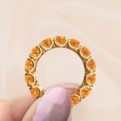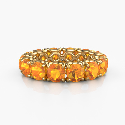 This is our Estee 4.7 ring. This specific type is called an eternity ring and it is set with a continuous line of identically cut gemstones. The ring is made in 14 Carat gold and is set with small citrin, 4.7 mm. This gold Eternity ring is a perfectly beautiful and meaningful way to give your proposal that special touch. The magnificent evenly shaped citrin are pave set around the ring. The identical citrin are carefully selected to give the ring a maximum effect. Do keep in mind we use natural resources so small differences between stones are common. The special effect is enhanced due to precise positioning of the citrin. This requires the utmost precision and a skilful hand but for our skilled artisans this is what excites them. The result is a ring with a row of citrin which seem to have no beginning nor end. The perfect symbol of your love for her! Isn't she a beauty?By using our modern techniques, we can design and customize the finest quality jewels with the utmost care for you. Our rings are always priced 30 percent lower than other jewellers. We make rings to order, so we don't have to maintain a large stock. If you have a certain budget, we are more than happy to advice you accordingly.
