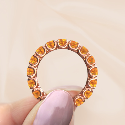 This Estee 4.0 ring in 14 Carat rose gold is set with citrin. This rose gold stacked Estee 4.0 ring is the perfect addition to your ring collection! As the name suggests, it is a ring which can be combined on one finger with another ring. It gives you the opportunity to create your own style. A stacked ring usually represents a certain memory of someone special or a memorable moment. It is common to combine a stacked ring, representing an anniversary, with a wedding ring. But this eternity ring, combined with your other rings, also makes a classy fashion item. As soon as you finished designing your Estee 4.0 ring with our online tool, our goldsmiths will start their creative process of making your ring. This will be done with passion and care, according ancient crafting. On top of that, our jewels are made of eco-friendly materials. Simply customize online with our online tool, if you want any changes made. If you want specific changes made to your Estee 4.0 ring, that are unavailable in our online tool, please feel free to contact our expert designers.By using our modern techniques, we can design and customize the finest quality jewels with the utmost care for you. Our rings are always priced 30 percent lower than other jewellers. We make rings to order, so we don't have to maintain a large stock. If you have a certain budget, we are more than happy to advice you accordingly.To make it easier for you, we offer a 30 day return policy. Check our terms and conditions.