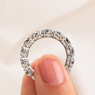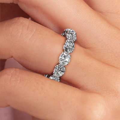 This is our Vivienne OVL 5x4 ring. This specific type is called an eternity ring and it is set with a continuous line of identically cut gemstones. The ring is made in 14 Carat white gold and is set with small diamonds, 0.35 crt. This white gold Eternity ring is a perfectly beautiful and meaningful way to give your proposal that special touch. The magnificent evenly shaped diamonds are pave set around the ring. The identical diamonds are carefully selected to give the ring a maximum effect. Do keep in mind we use natural resources so small differences between stones are common. The special effect is enhanced due to precise positioning of the diamonds. This requires the utmost precision and a skilful hand but for our skilled artisans this is what excites them. The result is a ring with a row of diamonds which seem to have no beginning nor end. The perfect symbol of your love for her! Isn't she a beauty?By using our modern techniques, we can design and customize the finest quality jewels with the utmost care for you. Our rings are always priced 30 percent lower than other jewellers. We make rings to order, so we don't have to maintain a large stock. If you have a certain budget, we are more than happy to advice you accordingly.New jewellery designs are added to our online collection daily. Our team of passionate designers strive to create extraordinary and diverse designs. Have you seen a ring you like? Please feel free to contact us. Based on a good price/ quality ratio, we will make you an offer you can't refuse!To make it easier for you, we offer a 30 day return policy. Check our terms and conditions.