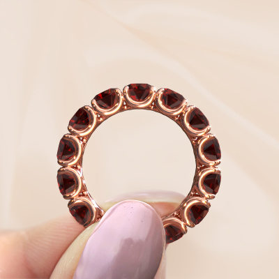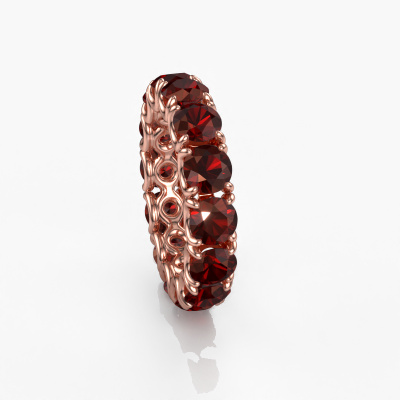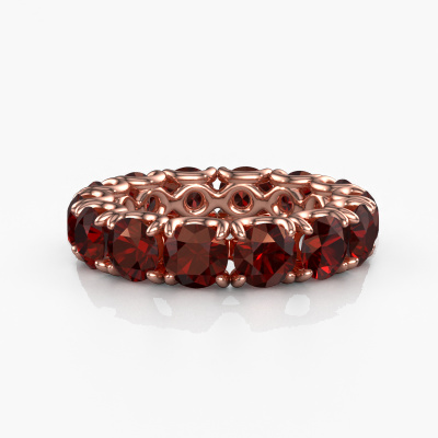 This is our Estee 4.7 ring. This specific type is called an eternity ring and it is set with a continuous line of identically cut gemstones. The ring is made in 14 Carat rose gold and is set with small garnet, 4.7 mm. This rose gold Eternity ring is a perfectly beautiful and meaningful way to give your proposal that special touch. The magnificent evenly shaped garnet are pave set around the ring. The identical garnet are carefully selected to give the ring a maximum effect. Do keep in mind we use natural resources so small differences between stones are common. The special effect is enhanced due to precise positioning of the garnet. This requires the utmost precision and a skilful hand but for our skilled artisans this is what excites them. The result is a ring with a row of garnet which seem to have no beginning nor end. The perfect symbol of your love for her! Isn't she a beauty?By using our modern techniques, we can design and customize the finest quality jewels with the utmost care for you. Our rings are always priced 30 percent lower than other jewellers. We make rings to order, so we don't have to maintain a large stock. If you have a certain budget, we are more than happy to advice you accordingly.