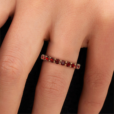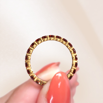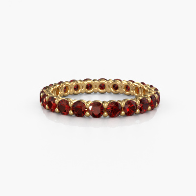 This is our Heddy rnd 2.7 ring. This specific type is called an eternity ring and it is set with a continuous line of identically cut gemstones. The ring is made in 14 Carat gold and is set with small garnet, 2.7 mm. This gold Eternity ring is a perfectly beautiful and meaningful way to give your proposal that special touch. The magnificent evenly shaped garnet are pave set around the ring. The identical garnet are carefully selected to give the ring a maximum effect. Do keep in mind we use natural resources so small differences between stones are common. The special effect is enhanced due to precise positioning of the garnet. This requires the utmost precision and a skilful hand but for our skilled artisans this is what excites them. The result is a stackable ring with a row of garnet which seem to have no beginning nor end. The perfect symbol of your love for her! Isn't she a beauty?Because we design and deliver our own rings, we can offer you a ring at a price you won't find anywhere else. A ring is made to order, which helps prevent excess supplies, so we can make you a great price offer. We understand it feels risky, buying your ring online, but we will gladly assist in the designing process, taking your budget into consideration.Our team of talented, passionate designers add new ring designs to our online collection daily. Our objective in doing so, is to be able to offer you a wide variety of jewels. Please feel free to request a quote if you have specific wishes for your ring. We guarantee to make you an offer you can't refuse.To make it easier for you, we offer a 30 day return policy. Check our terms and conditions.