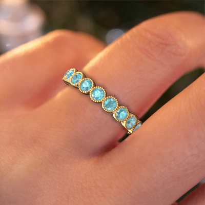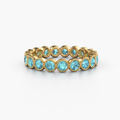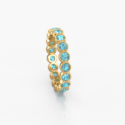 This is our Mariam 0.07 ring. This specific type is called an eternity ring and it is set with a continuous line of identically cut gemstones. The ring is made in 14 Carat gold and is set with small blue topaz, 2.7 mm. The amazing blue topaz are identical in size and are set in the ring band. Our blue topaz are selected with great care so they are identical, which gives the best result. In order to get the best result, our artisans position all blue topaz by hand with the utmost care. Our Goldsmiths have one ambition, which is creating the perfect ring. That is why we love what we do. In the end you get a stunning trendy gold ring with a row of blue topaz which seem to have no beginning nor end. The perfect symbol of your undying love for her! How special is that!After receiving your order, our goldsmiths will passionately start the creative process of making your ring in our own studio. Because we don't have a big stockpile, these costs will not be passed on to you. Our pricing is proof of that! We offer top quality jewels at lowest price, guaranteed.Our talented designers add new designs to our online collection daily. Together they create a diverse collection of the finest jewellery. If you prefer to make a ring according your own design, please feel free to request a quote. We will make you an amazing offer, based on quality and price.To make it easier for you, we offer a 30 day return policy. Check our terms and conditions.