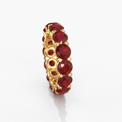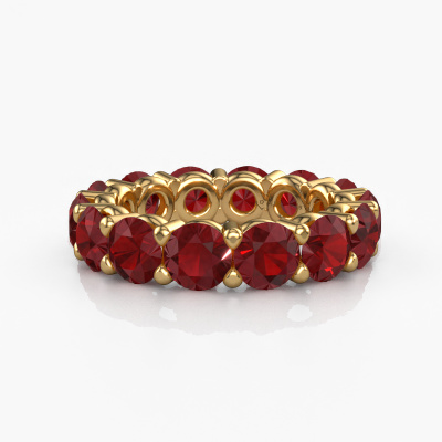 This is our Heddy rnd 5.0 ring. This specific type is called an eternity ring and it is set with a continuous line of identically cut gemstones. The ring is made in 14 Carat gold and is set with small ruby, 5 mm. The amazing ruby are identical in size and are set in the ring band. Our ruby are selected with great care so they are identical, which gives the best result. In order to get the best result, our artisans position all ruby by hand with the utmost care. Our Goldsmiths have one ambition, which is creating the perfect ring. That is why we love what we do. In the end you get a stunning exclusive gold ring with a row of ruby which seem to have no beginning nor end. The perfect symbol of your undying love for her! How special is that!By using a combination of the latest modern techniques, combined with ancient crafting, we can make all our rings in our own studio. Each jewel is made to order. This is advantageous because we can offer you a price you won't find anywhere else.