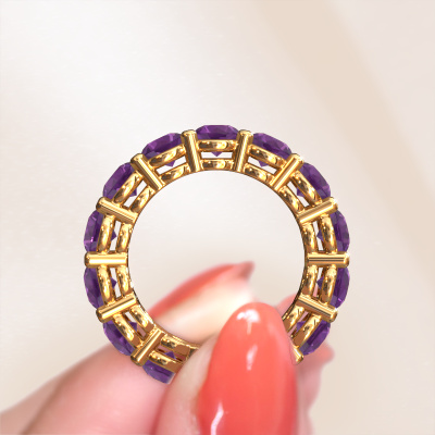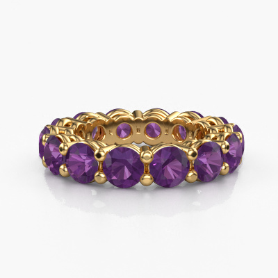 This is our Michelle full 4.7 ring. This specific type is called an eternity ring and it is set with a continuous line of identically cut gemstones. The ring is made in 14 Carat gold and is set with small amethysten, 4.7 mm. The amazing amethysten are identical in size and are set in the ring band. Our amethysten are selected with great care so they are identical, which gives the best result. In order to get the best result, our artisans position all amethysten by hand with the utmost care. Our Goldsmiths have one ambition, which is creating the perfect ring. That is why we love what we do. In the end you get a stunning exclusive gold stackable ring with a row of amethysten which seem to have no beginning nor end. The perfect symbol of your undying love for her! How special is that!Because we design and deliver our own rings, we can offer you a ring at a price you won't find anywhere else. A ring is made to order, which helps prevent excess supplies, so we can make you a great price offer. We understand it feels risky, buying your ring online, but we will gladly assist in the designing process, taking your budget into consideration.Our team of talented, passionate designers add new ring designs to our online collection daily. Our objective in doing so, is to be able to offer you a wide variety of jewels. Please feel free to request a quote if you have specific wishes for your ring. We guarantee to make you an offer you can't refuse.To make it easier for you, we offer a 30 day return policy. Check our terms and conditions.