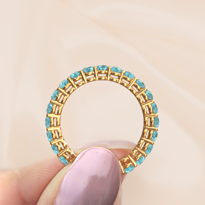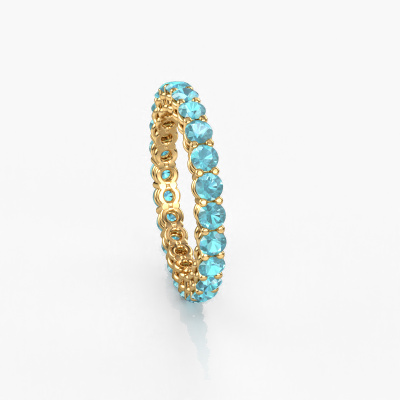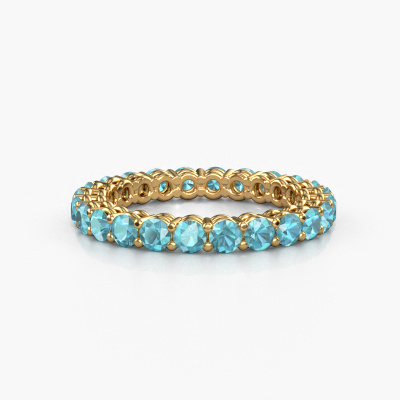 This is our Michelle full 2.7 ring. This specific type is called an eternity ring and it is set with a continuous line of identically cut gemstones. The ring is made in 14 Carat gold and is set with small blue topaz, 2.7 mm. The amazing blue topaz are identical in size and are set in the ring band. Our blue topaz are selected with great care so they are identical, which gives the best result. In order to get the best result, our artisans position all blue topaz by hand with the utmost care. Our Goldsmiths have one ambition, which is creating the perfect ring. That is why we love what we do. In the end you get a stunning classic gold stackable ring with a row of blue topaz which seem to have no beginning nor end. The perfect symbol of your undying love for her! How special is that!By using a combination of the latest modern techniques, combined with ancient crafting, we can make all our rings in our own studio. Each jewel is made to order. This is advantageous because we can offer you a price you won't find anywhere else.New jewellery designs are added to our online collection daily. Our team of passionate designers strive to create extraordinary and diverse designs. Have you seen a ring you like? Please feel free to contact us. Based on a good price/ quality ratio, we will make you an offer you can't refuse!To make it easier for you, we offer a 30 day return policy. Check our terms and conditions.