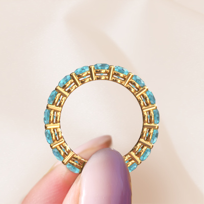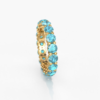 This is our Michelle full 3.7 ring. This specific type is called an eternity ring and it is set with a continuous line of identically cut gemstones. The ring is made in 14 Carat gold and is set with small blue topaz, 3.7 mm. The amazing blue topaz are identical in size and are set in the ring band. Our blue topaz are selected with great care so they are identical, which gives the best result. In order to get the best result, our artisans position all blue topaz by hand with the utmost care. Our Goldsmiths have one ambition, which is creating the perfect ring. That is why we love what we do. In the end you get a stunning modern gold stackable ring with a row of blue topaz which seem to have no beginning nor end. The perfect symbol of your undying love for her! How special is that!Because we design and deliver our own rings, we can offer you a ring at a price you won't find anywhere else. A ring is made to order, which helps prevent excess supplies, so we can make you a great price offer. We understand it feels risky, buying your ring online, but we will gladly assist in the designing process, taking your budget into consideration.Our team of talented, passionate designers add new ring designs to our online collection daily. Our objective in doing so, is to be able to offer you a wide variety of jewels. Please feel free to request a quote if you have specific wishes for your ring. We guarantee to make you an offer you can't refuse.To make it easier for you, we offer a 30 day return policy. Check our terms and conditions.