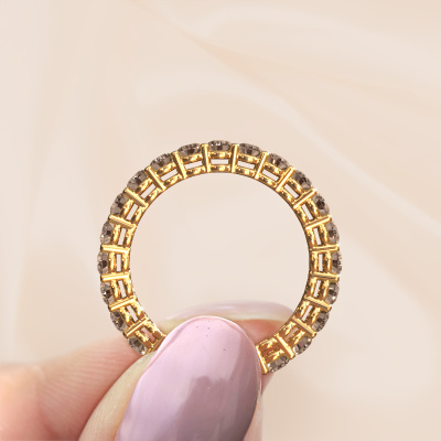 This is our Michelle full 2.7 ring. This specific type is called an eternity ring and it is set with a continuous line of identically cut gemstones. The ring is made in 14 Carat gold and is set with small brown diamonds, 1.92 crt. The amazing brown diamonds are identical in size and are set in the ring band. Our brown diamonds are selected with great care so they are identical, which gives the best result. In order to get the best result, our artisans position all brown diamonds by hand with the utmost care. Our Goldsmiths have one ambition, which is creating the perfect ring. That is why we love what we do. In the end you get a stunning classic gold stackable ring with a row of brown diamonds which seem to have no beginning nor end. The perfect symbol of your undying love for her! How special is that!By using a combination of the latest modern techniques, combined with ancient crafting, we can make all our rings in our own studio. Each jewel is made to order. This is advantageous because we can offer you a price you won't find anywhere else.New jewellery designs are added to our online collection daily. Our team of passionate designers strive to create extraordinary and diverse designs. Have you seen a ring you like? Please feel free to contact us. Based on a good price/ quality ratio, we will make you an offer you can't refuse!To make it easier for you, we offer a 30 day return policy. Check our terms and conditions.
