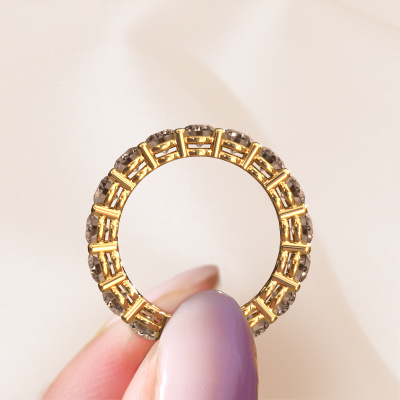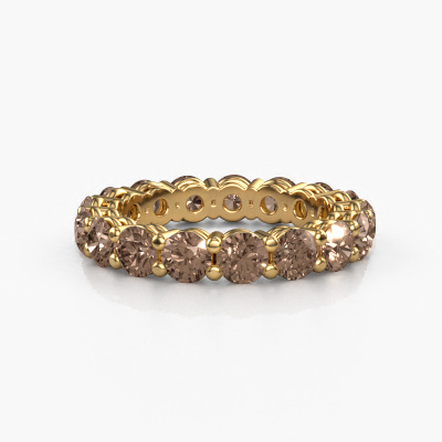 This is our Michelle full 3.7 ring. This specific type is called an eternity ring and it is set with a continuous line of identically cut gemstones. The ring is made in 14 Carat gold and is set with small brown diamonds, 3.60 crt. The amazing brown diamonds are identical in size and are set in the ring band. Our brown diamonds are selected with great care so they are identical, which gives the best result. In order to get the best result, our artisans position all brown diamonds by hand with the utmost care. Our Goldsmiths have one ambition, which is creating the perfect ring. That is why we love what we do. In the end you get a stunning modern gold stackable ring with a row of brown diamonds which seem to have no beginning nor end. The perfect symbol of your undying love for her! How special is that!Because we design and deliver our own rings, we can offer you a ring at a price you won't find anywhere else. A ring is made to order, which helps prevent excess supplies, so we can make you a great price offer. We understand it feels risky, buying your ring online, but we will gladly assist in the designing process, taking your budget into consideration.Our team of talented, passionate designers add new ring designs to our online collection daily. Our objective in doing so, is to be able to offer you a wide variety of jewels. Please feel free to request a quote if you have specific wishes for your ring. We guarantee to make you an offer you can't refuse.To make it easier for you, we offer a 30 day return policy. Check our terms and conditions.