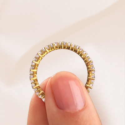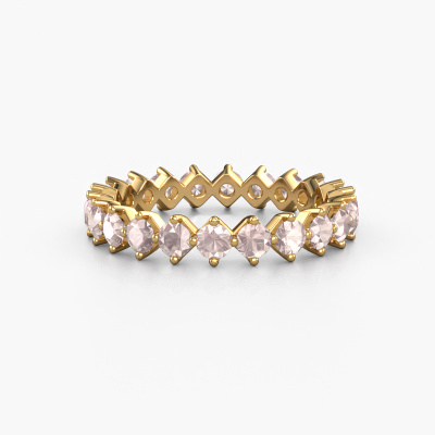 This is our Janie 2.7mm ring. This specific type is called an eternity ring and it is set with a continuous line of identically cut gemstones. The ring is made in 14 Carat gold and is set with small morganite champagne, 2.7 mm. The amazing morganite champagne are identical in size and are set in the ring band. Our morganite champagne are selected with great care so they are identical, which gives the best result. In order to get the best result, our artisans position all morganite champagne by hand with the utmost care. Our Goldsmiths have one ambition, which is creating the perfect ring. That is why we love what we do. In the end you get a stunning trendy gold stackable ring with a row of morganite champagne which seem to have no beginning nor end. The perfect symbol of your undying love for her! How special is that!