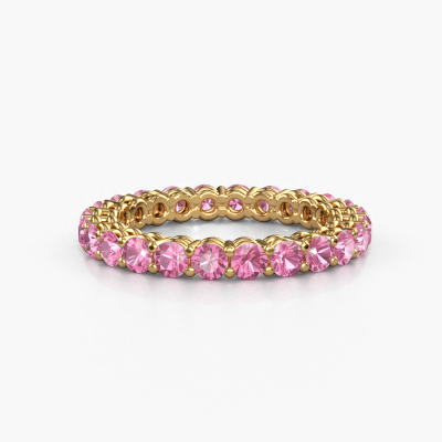 This is our Michelle full 2.7 ring. This specific type is called an eternity ring and it is set with a continuous line of identically cut gemstones. The ring is made in 14 Carat gold and is set with small pink sapphire, 2.7 mm. The amazing pink sapphire are identical in size and are set in the ring band. Our pink sapphire are selected with great care so they are identical, which gives the best result. In order to get the best result, our artisans position all pink sapphire by hand with the utmost care. Our Goldsmiths have one ambition, which is creating the perfect ring. That is why we love what we do. In the end you get a stunning classic gold stackable ring with a row of pink sapphire which seem to have no beginning nor end. The perfect symbol of your undying love for her! How special is that!By using a combination of the latest modern techniques, combined with ancient crafting, we can make all our rings in our own studio. Each jewel is made to order. This is advantageous because we can offer you a price you won't find anywhere else.New jewellery designs are added to our online collection daily. Our team of passionate designers strive to create extraordinary and diverse designs. Have you seen a ring you like? Please feel free to contact us. Based on a good price/ quality ratio, we will make you an offer you can't refuse!To make it easier for you, we offer a 30 day return policy. Check our terms and conditions.