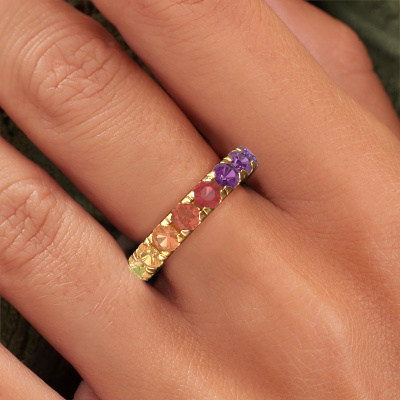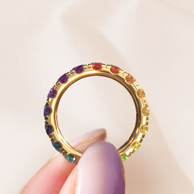 This is our Jackie 3.7 ring. This specific type is called an eternity ring and it is set with a continuous line of identically cut gemstones. The ring is made in 14 Carat gold and is set with small Rainbow sapphire 1, 3.7 mm. The amazing Rainbow sapphire 1 are identical in size and are set in the ring band. Our Rainbow sapphire 1 are selected with great care so they are identical, which gives the best result. In order to get the best result, our artisans position all Rainbow sapphire 1 by hand with the utmost care. Our Goldsmiths have one ambition, which is creating the perfect ring. That is why we love what we do. In the end you get a stunning modern gold stackable ring with a row of Rainbow sapphire 1 which seem to have no beginning nor end. The perfect symbol of your undying love for her! How special is that!By using our modern techniques, we can design and customize the finest quality jewels with the utmost care for you. Our rings are always priced 30 percent lower than other jewellers. We make rings to order, so we don't have to maintain a large stock. If you have a certain budget, we are more than happy to advice you accordingly.New jewellery designs are added to our online collection daily. Our team of passionate designers strive to create extraordinary and diverse designs. Have you seen a ring you like? Please feel free to contact us. Based on a good price/ quality ratio, we will make you an offer you can't refuse!To make it easier for you, we offer a 30 day return policy. Check our terms and conditions.