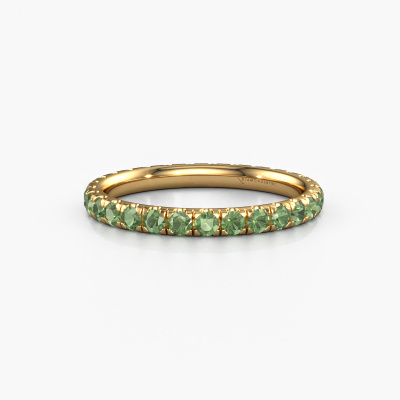 This is our Jackie 2.0 ring. This specific type is called an eternity ring and it is set with a continuous line of identically cut gemstones. The ring is made in 14 Carat gold and is set with small tourmaline green, 2 mm. The amazing tourmaline green are identical in size and are set in the ring band. Our tourmaline green are selected with great care so they are identical, which gives the best result. In order to get the best result, our artisans position all tourmaline green by hand with the utmost care. Our Goldsmiths have one ambition, which is creating the perfect ring. That is why we love what we do. In the end you get a stunning modern gold stackable ring with a row of tourmaline green which seem to have no beginning nor end. The perfect symbol of your undying love for her! How special is that!By using our modern techniques, we can design and customize the finest quality jewels with the utmost care for you. Our rings are always priced 30 percent lower than other jewellers. We make rings to order, so we don't have to maintain a large stock. If you have a certain budget, we are more than happy to advice you accordingly.New jewellery designs are added to our online collection daily. Our team of passionate designers strive to create extraordinary and diverse designs. Have you seen a ring you like? Please feel free to contact us. Based on a good price/ quality ratio, we will make you an offer you can't refuse!To make it easier for you, we offer a 30 day return policy. Check our terms and conditions.
