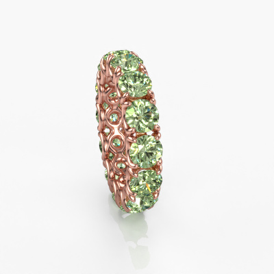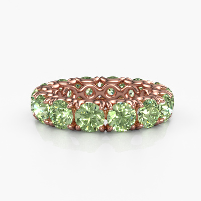 This is our Estee 4.7 ring. This specific type is called an eternity ring and it is set with a continuous line of identically cut gemstones. The ring is made in 14 Carat rose gold and is set with small green lab grown diamonds, 4.7 mm. This rose gold Eternity ring is a perfectly beautiful and meaningful way to give your proposal that special touch. The magnificent evenly shaped green lab grown diamonds are pave set around the ring. The identical green lab grown diamonds are carefully selected to give the ring a maximum effect. Do keep in mind we use natural resources so small differences between stones are common. The special effect is enhanced due to precise positioning of the green lab grown diamonds. This requires the utmost precision and a skilful hand but for our skilled artisans this is what excites them. The result is a ring with a row of green lab grown diamonds which seem to have no beginning nor end. The perfect symbol of your love for her! Isn't she a beauty?