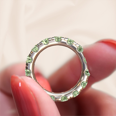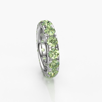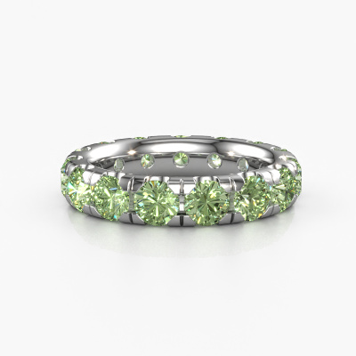 This is our Jackie 4.2 ring. This specific type is called an eternity ring and it is set with a continuous line of identically cut gemstones. The ring is made in 14 Carat white gold and is set with small green lab grown diamonds, 4.2 mm. This white gold Eternity ring is a perfectly beautiful and meaningful way to give your proposal that special touch. The magnificent evenly shaped green lab grown diamonds are pave set around the ring. The identical green lab grown diamonds are carefully selected to give the ring a maximum effect. Do keep in mind we use natural resources so small differences between stones are common. The special effect is enhanced due to precise positioning of the green lab grown diamonds. This requires the utmost precision and a skilful hand but for our skilled artisans this is what excites them. The result is a stackable ring with a row of green lab grown diamonds which seem to have no beginning nor end. The perfect symbol of your love for her! Isn't she a beauty?
