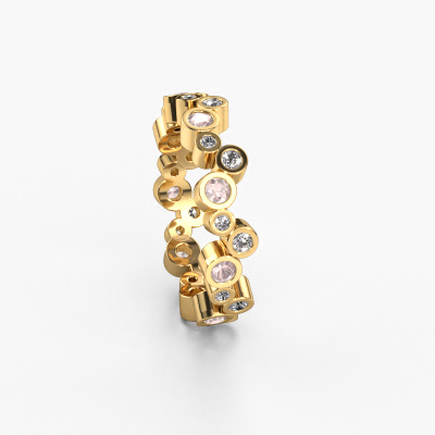 This is our Tessa ring. This specific type is called an eternity ring and it is set with a continuous line of identically cut gemstones. The ring is made in 14 Carat gold and is set with small morganite champagne, 2.5 mm. This gold Eternity ring is a perfectly beautiful and meaningful way to give your proposal that special touch. The magnificent evenly shaped morganite champagne are pave set around the ring. The identical morganite champagne are carefully selected to give the ring a maximum effect. Do keep in mind we use natural resources so small differences between stones are common. The special effect is enhanced due to precise positioning of the morganite champagne. This requires the utmost precision and a skilful hand but for our skilled artisans this is what excites them. The result is a ring with a row of morganite champagne which seem to have no beginning nor end. The perfect symbol of your love for her! Isn't she a beauty?